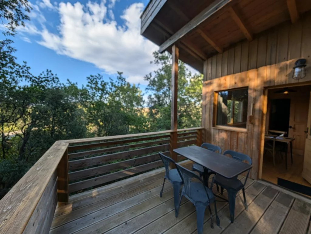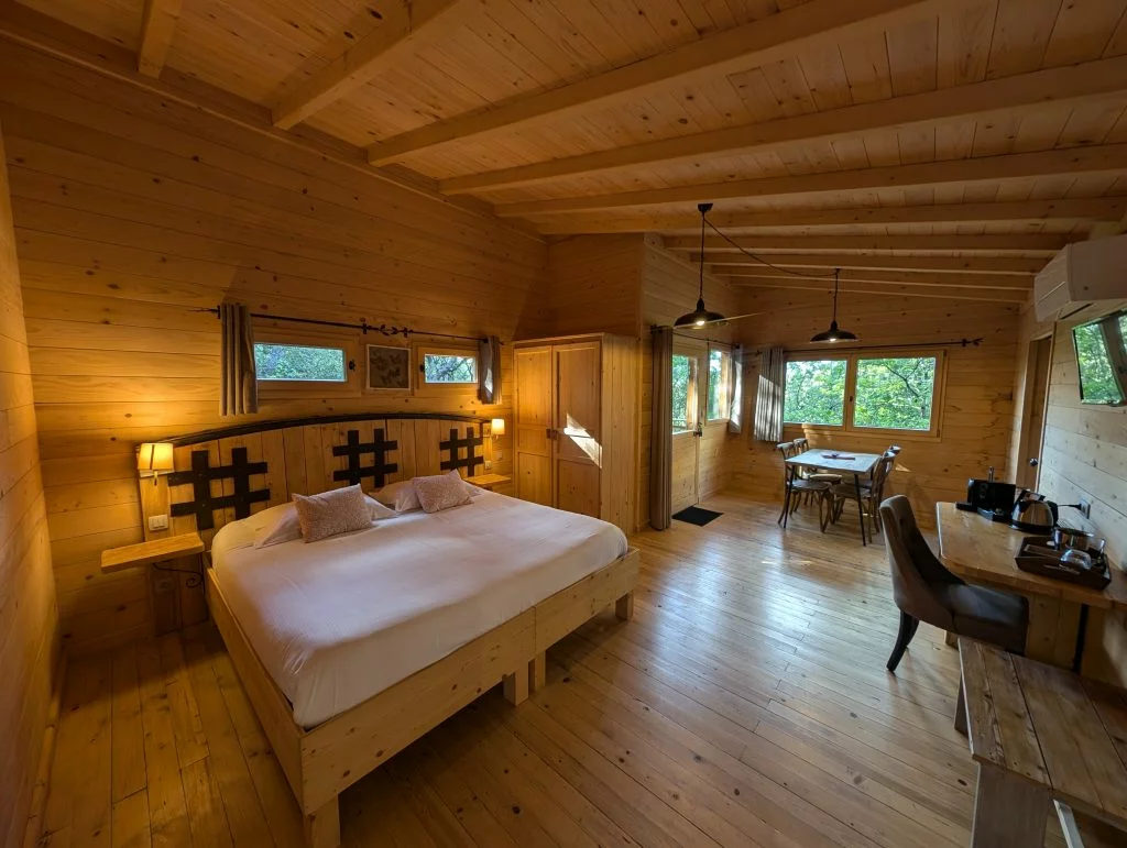 Les Cabanes dans les bois® est un hôtel un peu particulier. Ses chambres sont des cabanes et ses couloirs des sentiers. C’est le premier établissement de ce type à avoir un classement hôtelier .